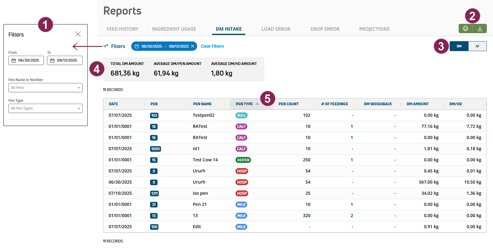 Use the DM Intake report to view dry matterClosed The dry weight of an ingredient with no mositure. (DM) and as-fed (AF) amounts delivered to the pens at your dairy.