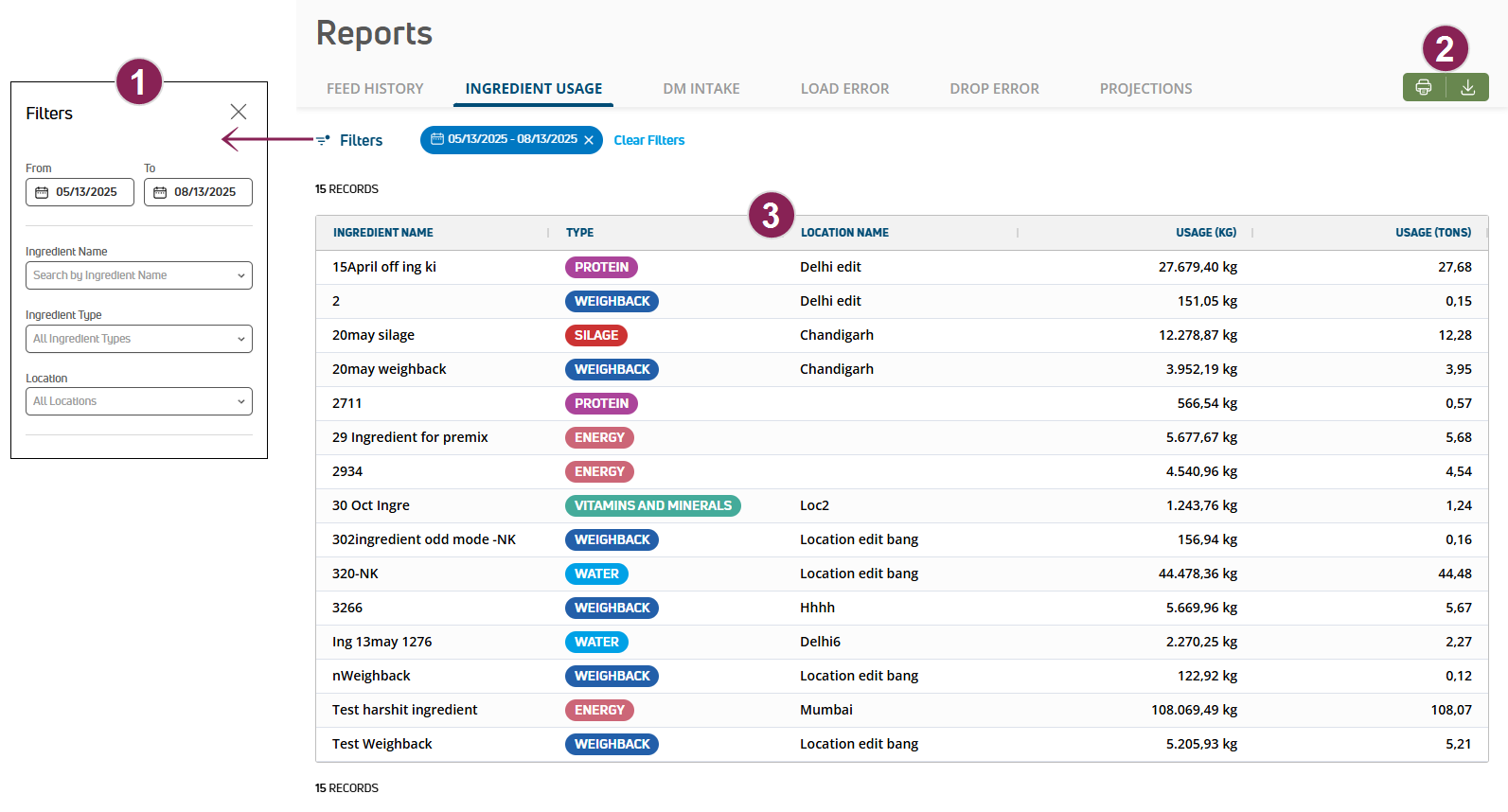 Use the Ingredient Usage report to view historical usage data for ingredients to track and analyze the ingredients used to feed your animals.