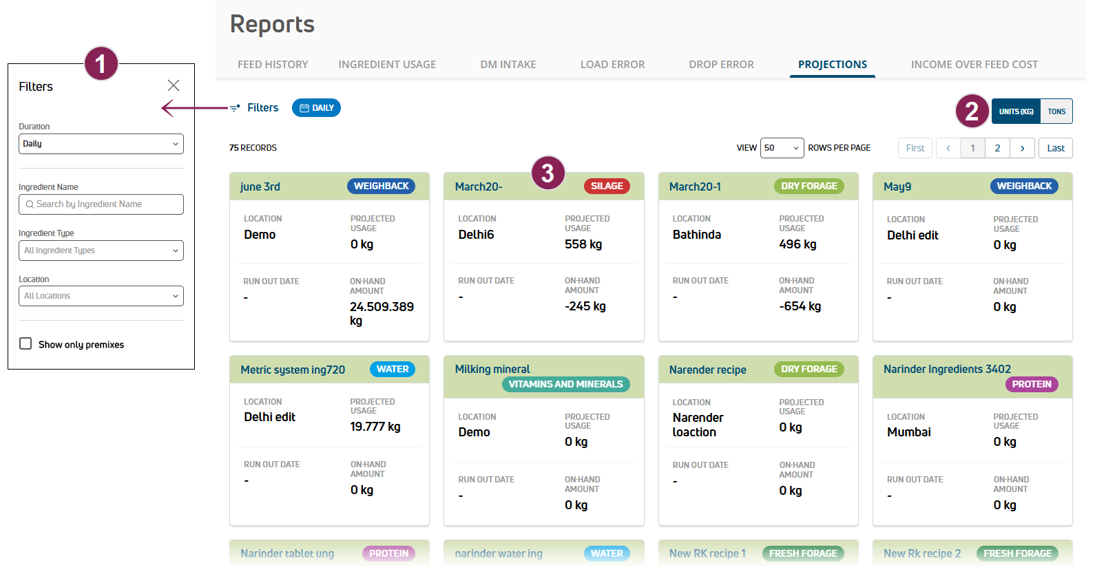 Use the Projections report to view on-hand and future amounts of ingredients needed to accommodate upcoming feedings. Set the Duration to view projected ingredient amounts needed for feedings during the selected time period (daily, weekly, monthly, etc.), or check individual ingredients for upcoming Run Out Dates.