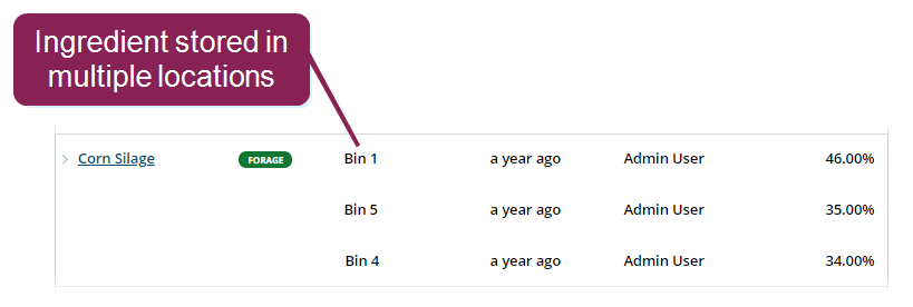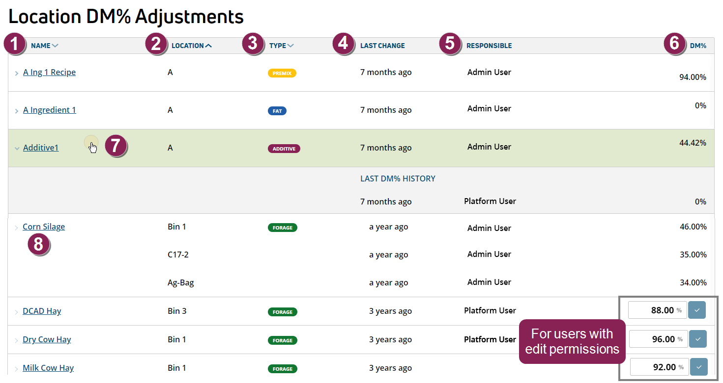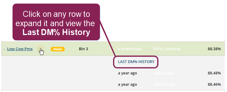 7. Last DM% History: Click on any ingredient to expand the row and view a history of the last time(s) the DM% was adjusted. If an ingredient has multiple locations, you can click on each location to view its respective Last DM% History.