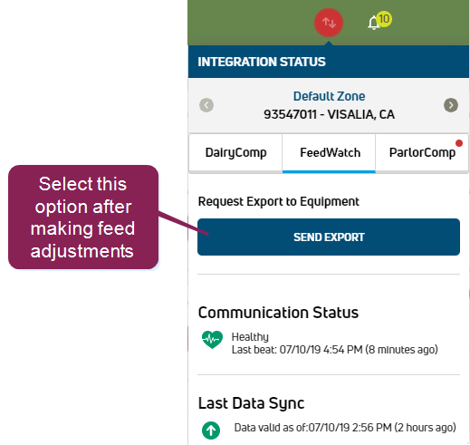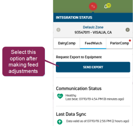 The Export to Equipment feature allows you to quickly send any feed changes to FeedWatch (on-premise) and out to your equipment. This includes any adjustments to recipes, ingredients, or DM%