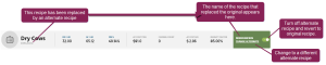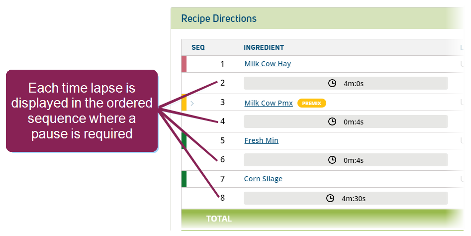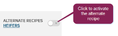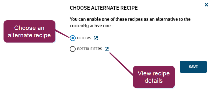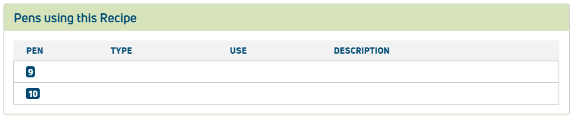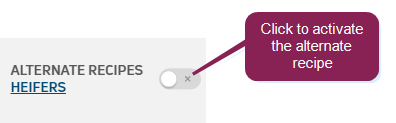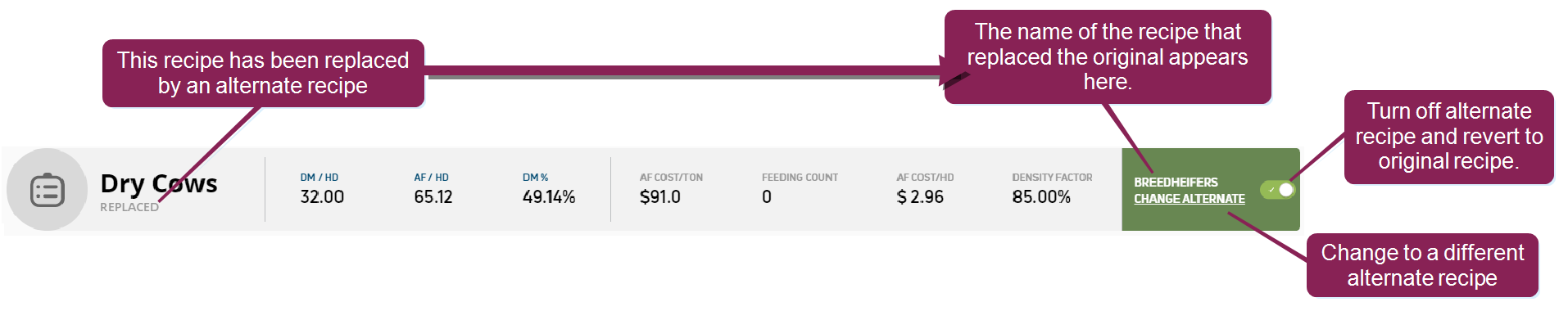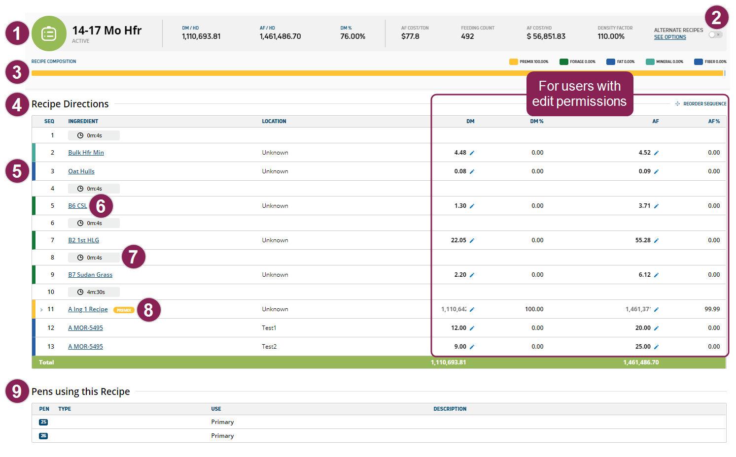 The Recipes Details page provides detailed information on the dairy’s recipes, including individual ingredient locations, as well as dry matterClosed The dry weight of an ingredient with no mositure. (DM) and as fed (AFClosed As fed) data.