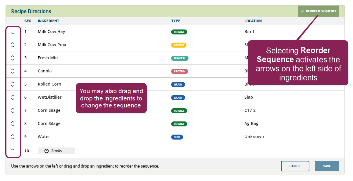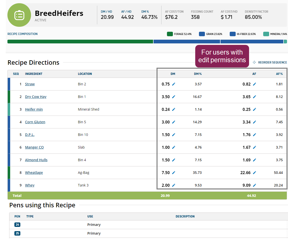 Users with permissions to edit this page can make adjustments to ingredient mixing order or to DM and AF quantities. If any DM or AF changes are made, the button activates so that you can save your changes.