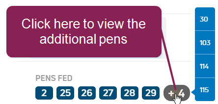 - Pens Fed: Pens that are fed by this recipe. If a recipe is assigned to 7 or more pens, the first 6 pen numbers are displayed, and a number such as +4 is shown at the end of the list to show how many additional pens are fed by the recipe. Click that last number in the list view a pop‑up list of the remaining pens.