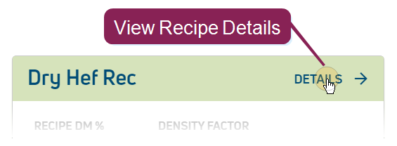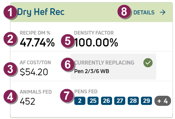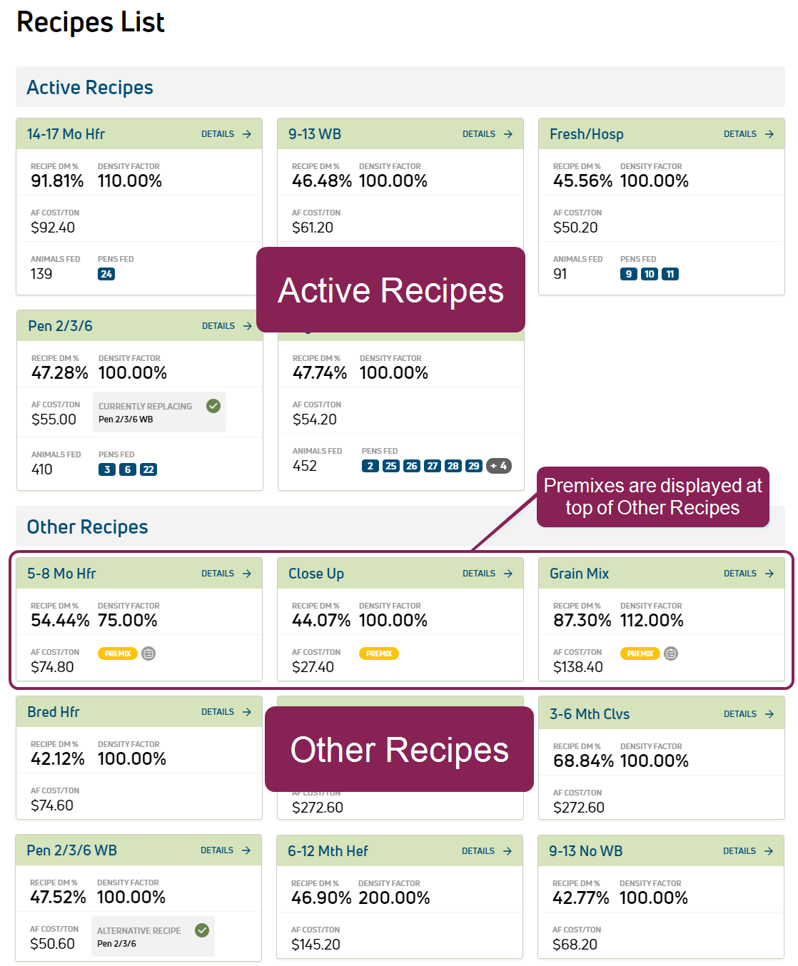 - Each recipe is represented by a recipe card that summarizes its ingredients, cost, animals fed, and related pens. Click the Details link at the top right of any recipe card to view its Recipes List.