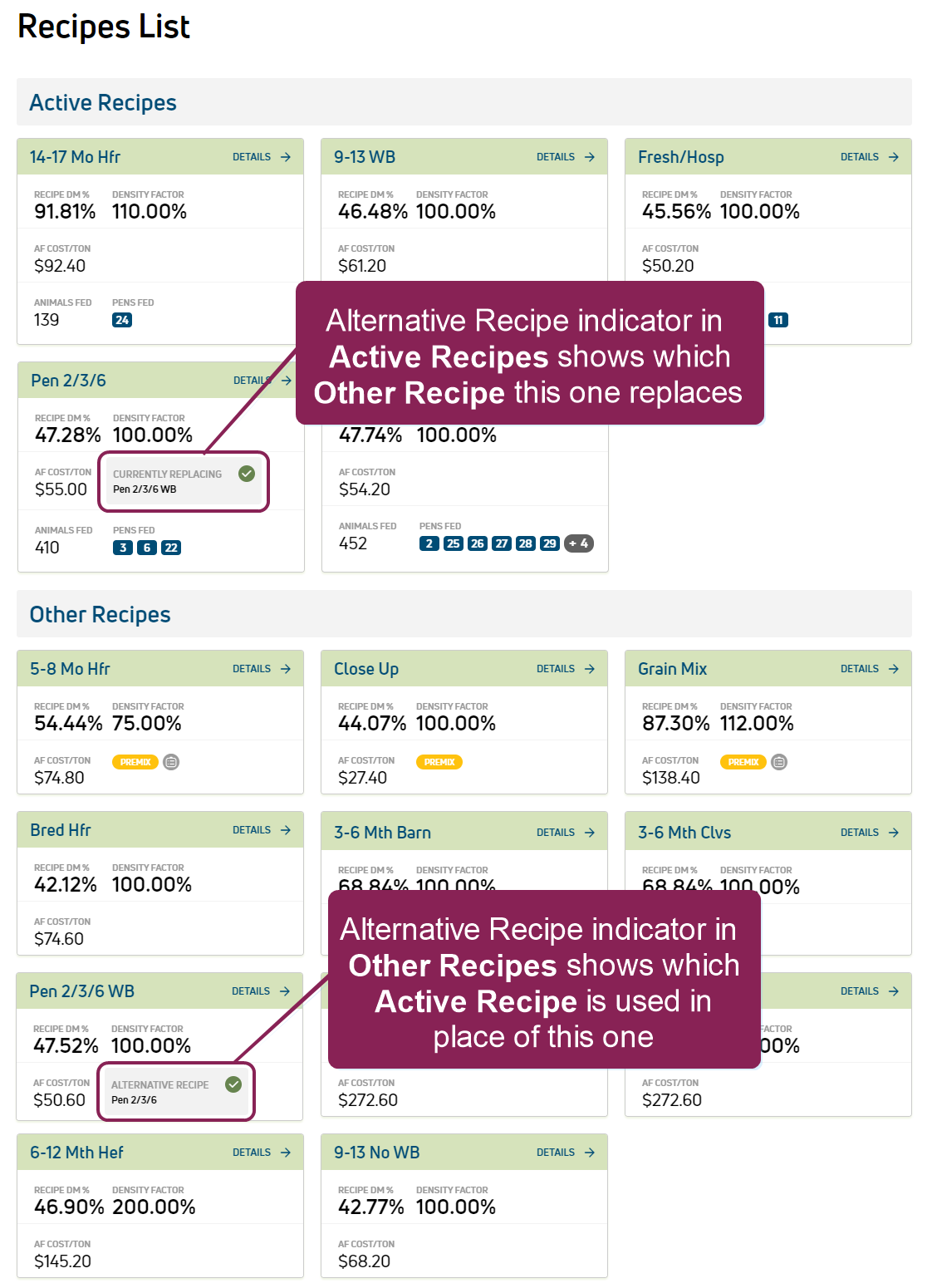 and an Alternative Recipe label that indicates the name of the Active Recipe that is feeding its pens (see example to the right). If you view the Recipes List, the Recipe Name in the Details Summary at the top of the page shows that this recipe has been replaced by a different recipe.