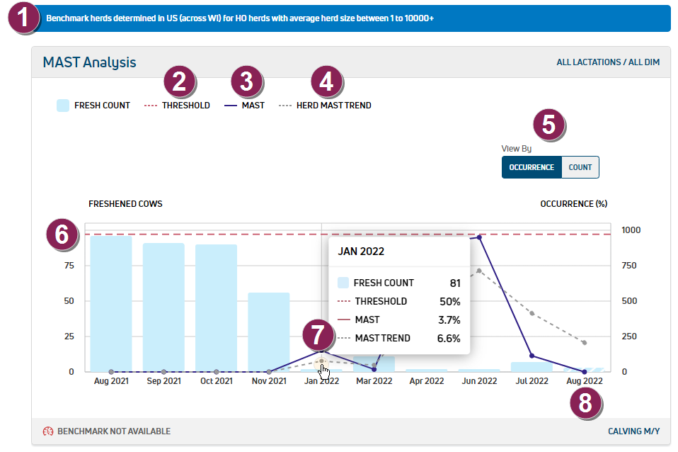 - Benchmark assigned: Based on your customization settings, your cows are compared to herds of similar locale and size. The blue bar identifies the benchmark details.