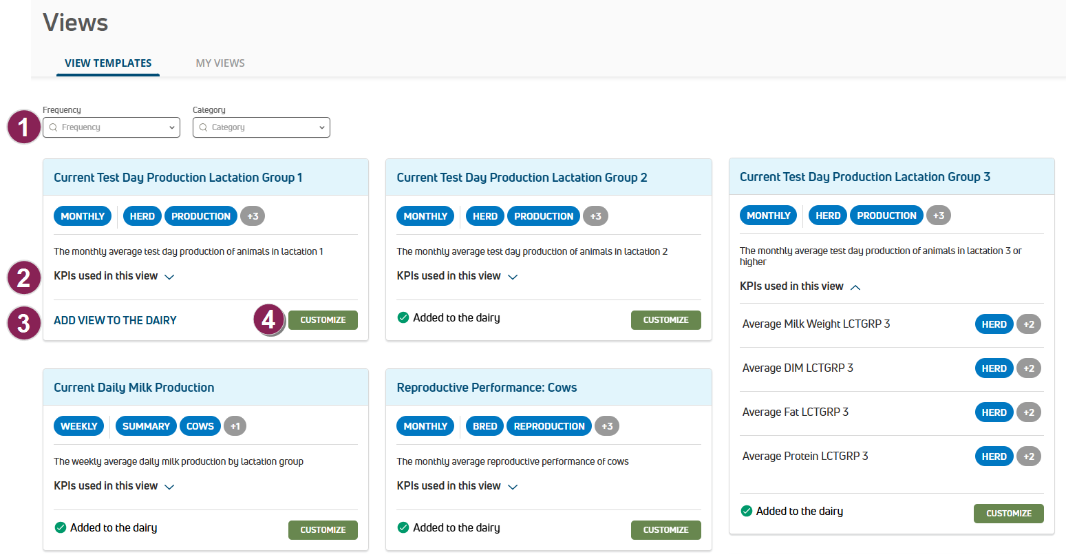 The Views page includes View Templates, or prebuilt data views, that are commonly tracked in our industry for milk production, health and wellness tracking, successful breeding programs, among other categories. Once saved, your views can be added to dashboards or viewed directly from the My Views tab.