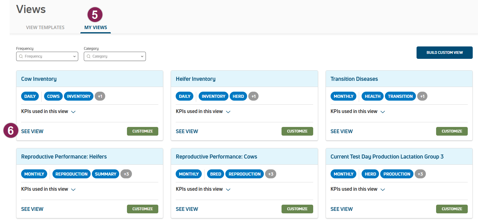 When you build custom views or add them from a template, they are automatically added to the My Views tab. The views available here can be added to your HerdSights Dashboards. See Add a Dashboard to build a new dashboard.