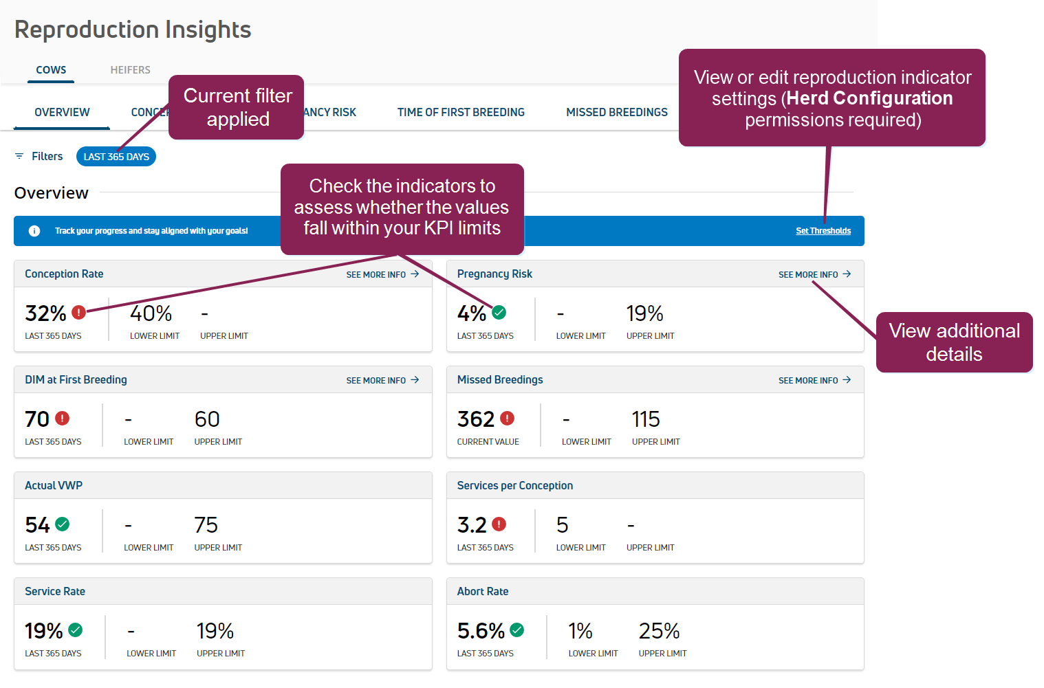Click Set Thresholds at the top right in the blue bar to view your dairy's current KPIs and edit the limits you want tracked on the Reproduction Insights report. See Reproduction Indicators