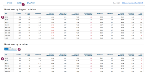 Days in milk tab on the RumINSIGHT report to view detailed fatty acid test results organized by Days in Milk (DIM) and lactation groups. Use the image and descriptions below to learn how to use the information on this page.