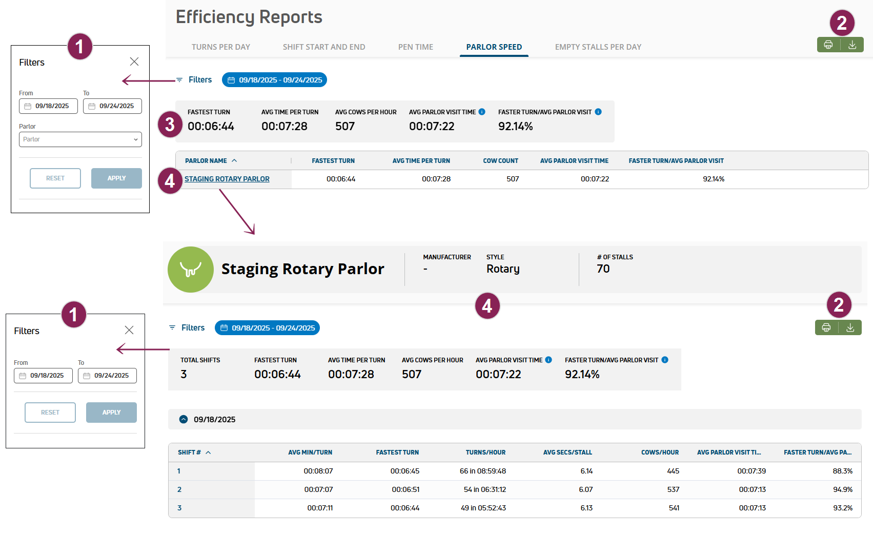 Use the Parlor Speed report to review and analyze parlor speed by parlor, date, and shift. This information can help you review your management strategies to improve efficiencies for specific parlors, shifts, or pens.