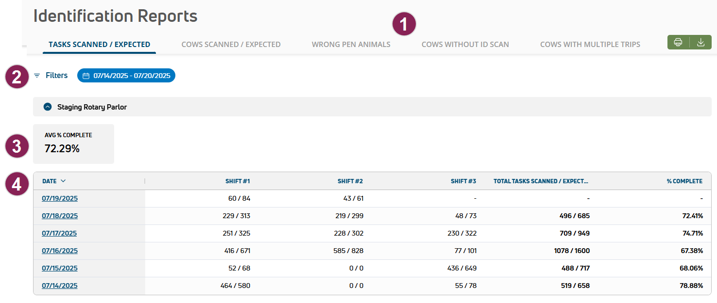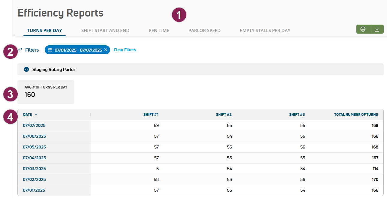 The Reports page allows you to view ParlorBoss efficiency and animal identification data in PULSE to help optimize your parlor operations. This information can help you review your management strategies to improve efficiencies for specific