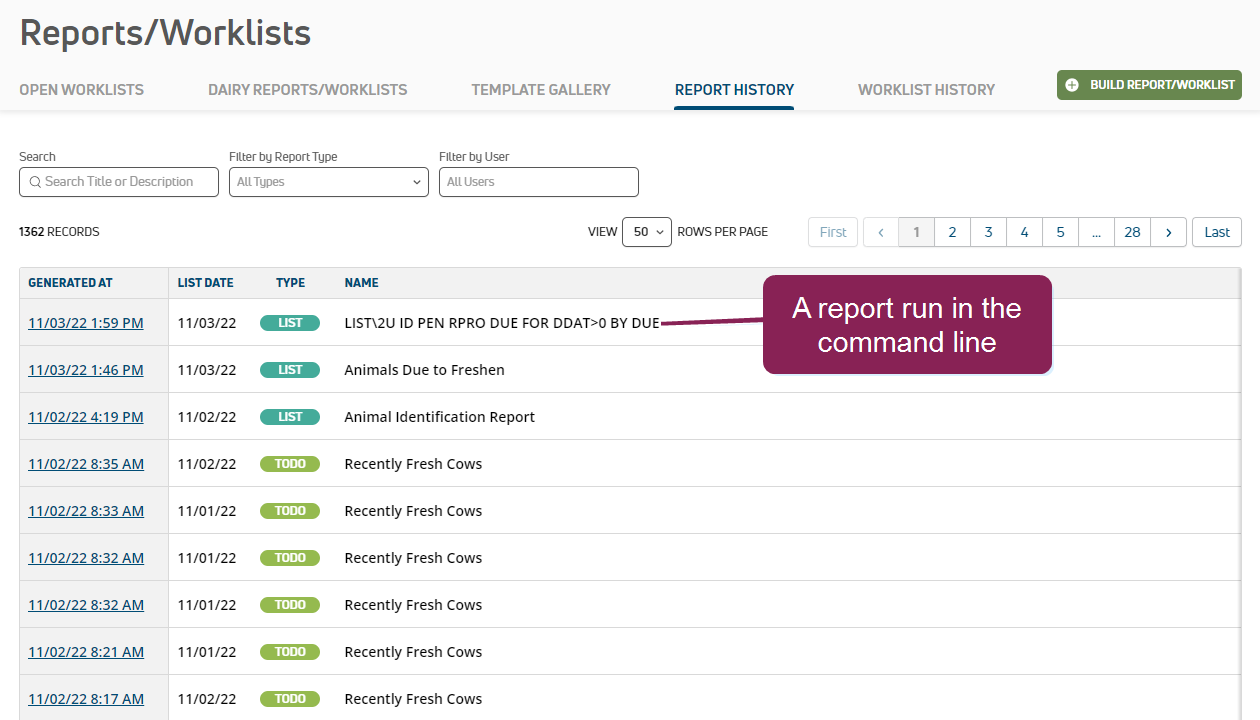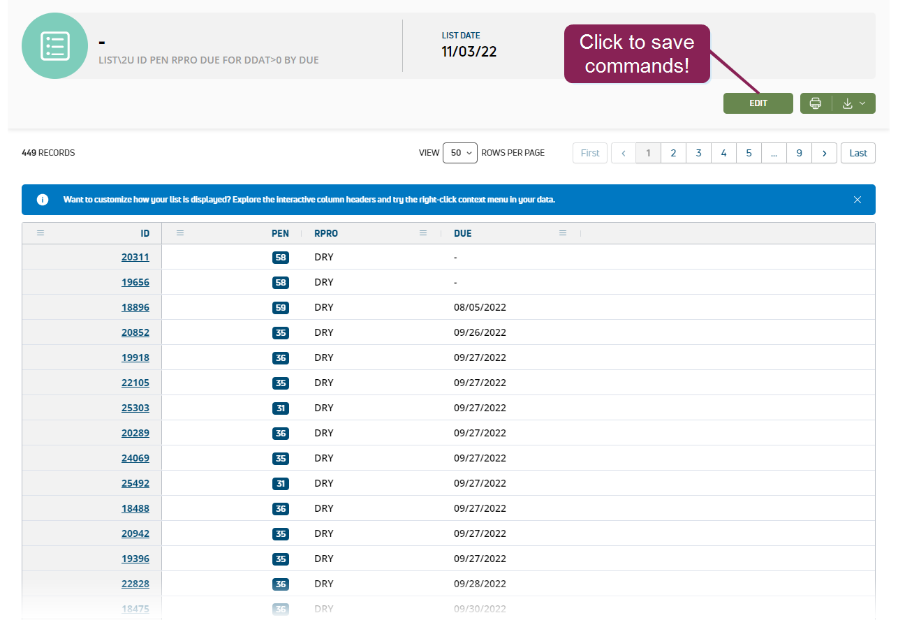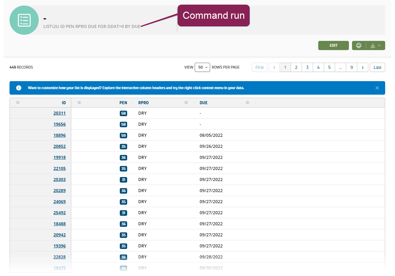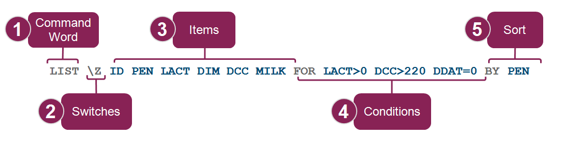 The Command Line brings the power of DairyComp into PULSE, allowing you to generate many of the same reports you're able to view in DairyComp. PULSE Command Line currently supports the LIST (SHOW)SUM, COUNT, and ENTER commands. You can find this feature on the main menu bar, or by selecting F9 from your keyboard.
