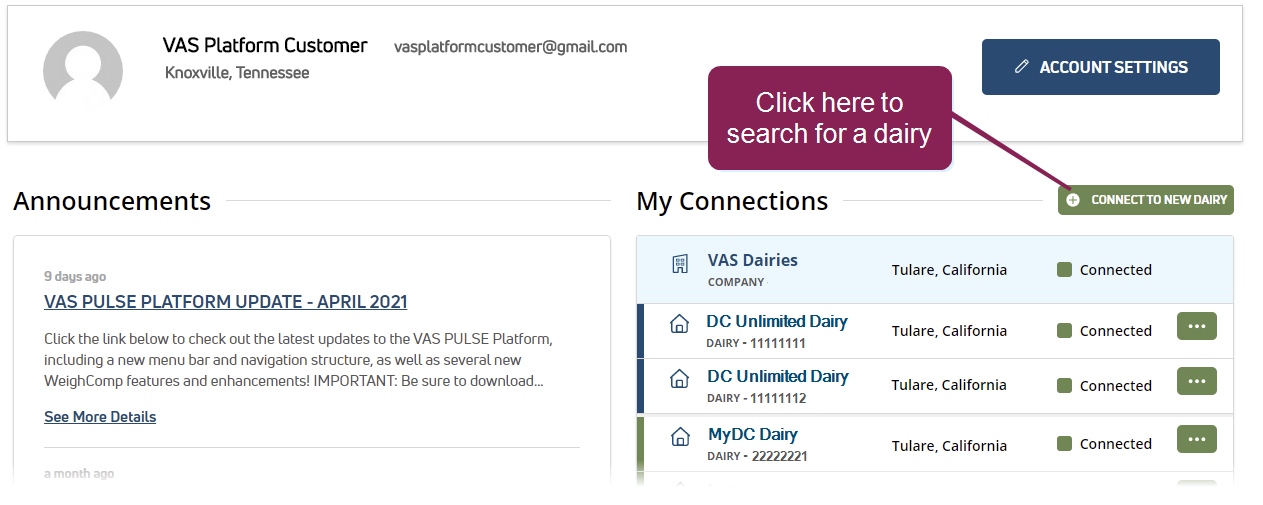 2. Click the Connect to New Dairy button on the top right of the My Connections list to locate the dairy you want to access.