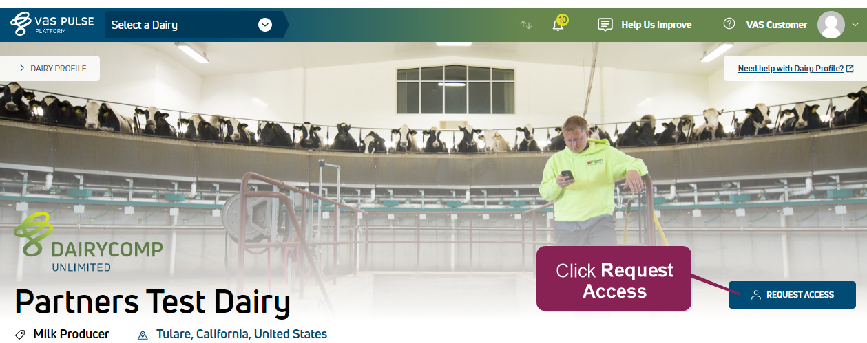 At this point, the system emails a request to all users at that dairy who are assigned to the Owner role. Any of those users can then grant you access to the dairy. You will receive an email notification when your request has been accepted. For more information on the Owner role, see Manage Dairy Users and Roles.