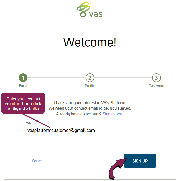 - Go to https://platform.vas.com/login, and click the Sign Up button.