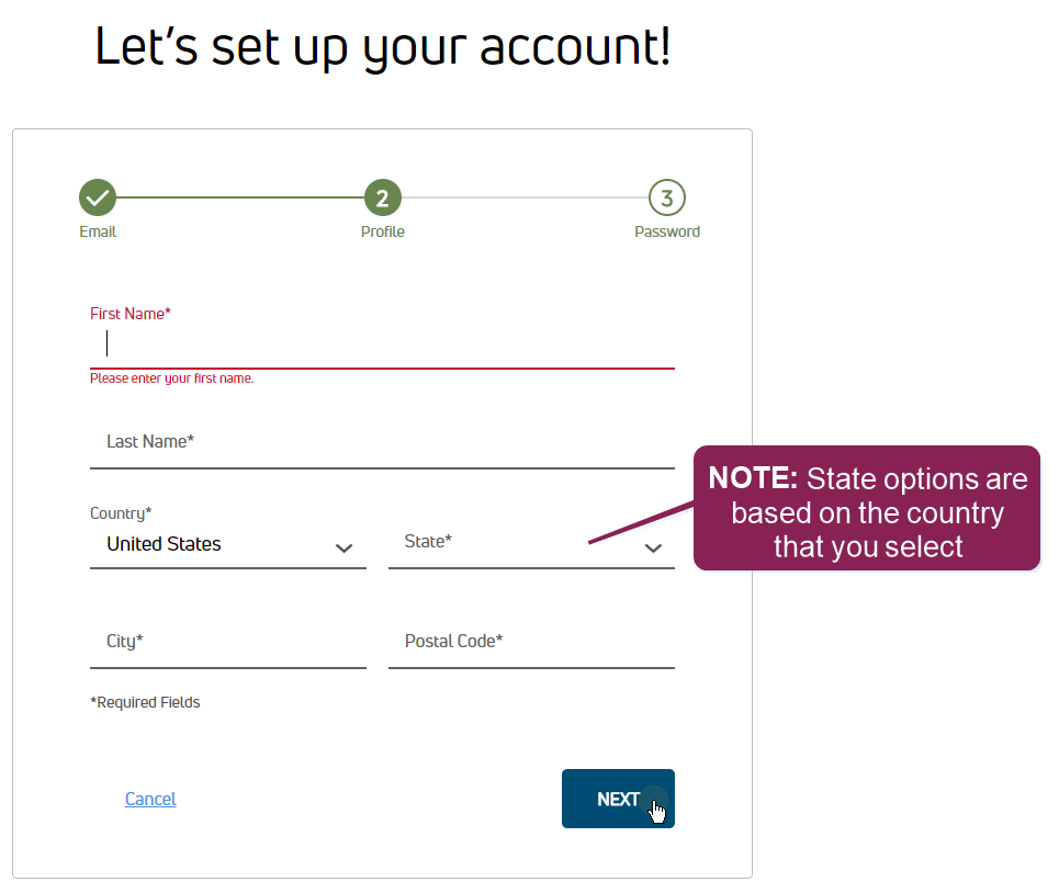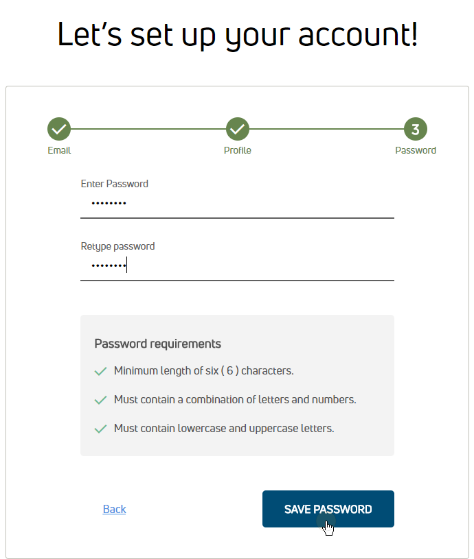 You will be directed back to the account set‑up screen, where you can finish entering your user profile details and set your password.