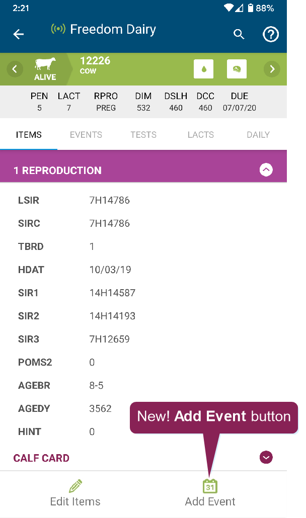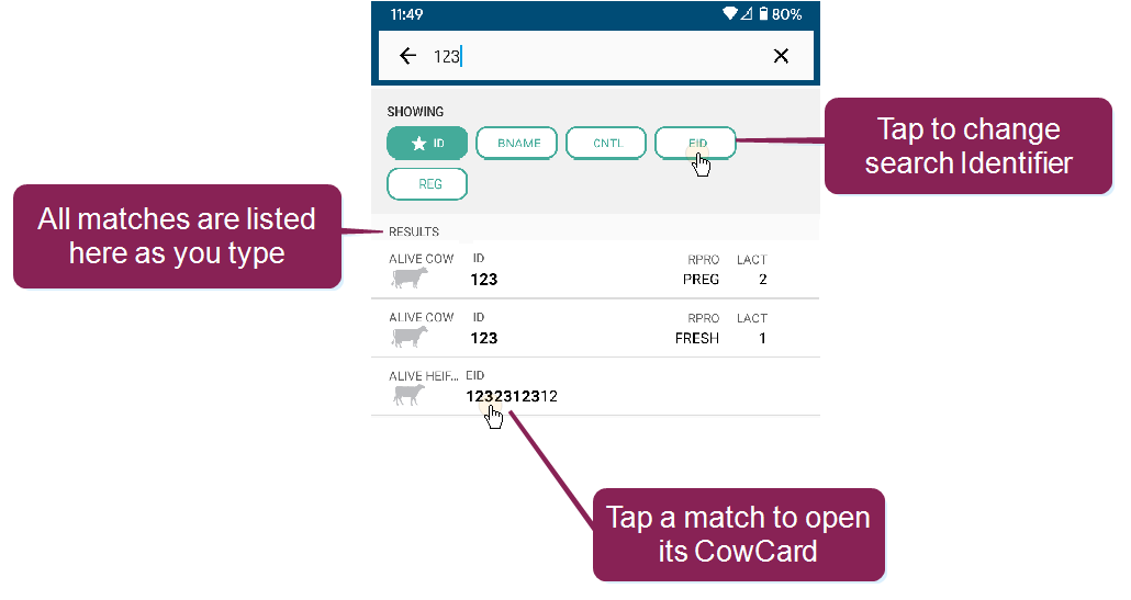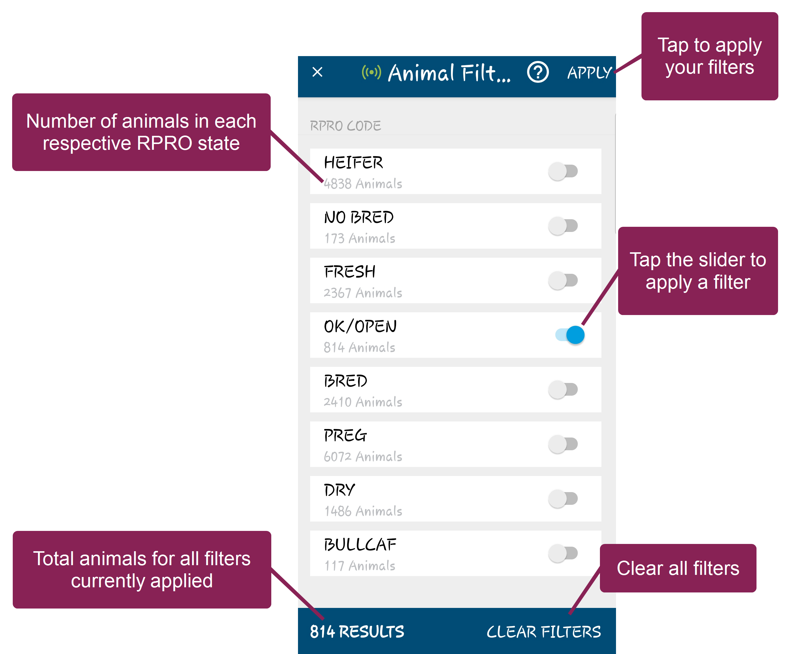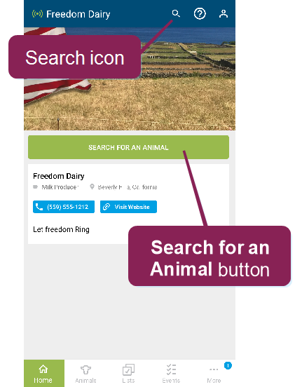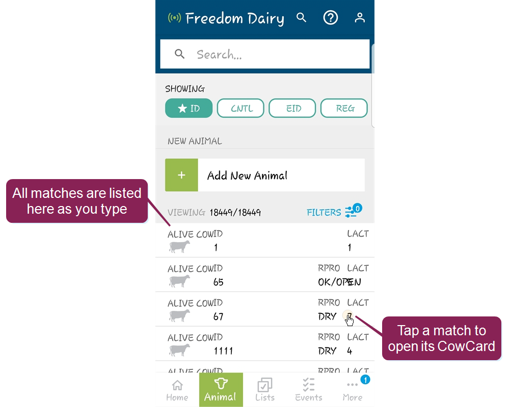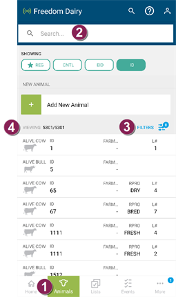 The Animals page in the mobile app allows you to view animals in your herd. When you tap the Animals button at the bottom of the mobile app, it opens to a list of all animals in your herd. From there, use the search field at the top to find a specific animal, or use the Filters option to narrow the list by RPROClosed Reproductive code code. Tap on any animal in the list to view its CowCard.