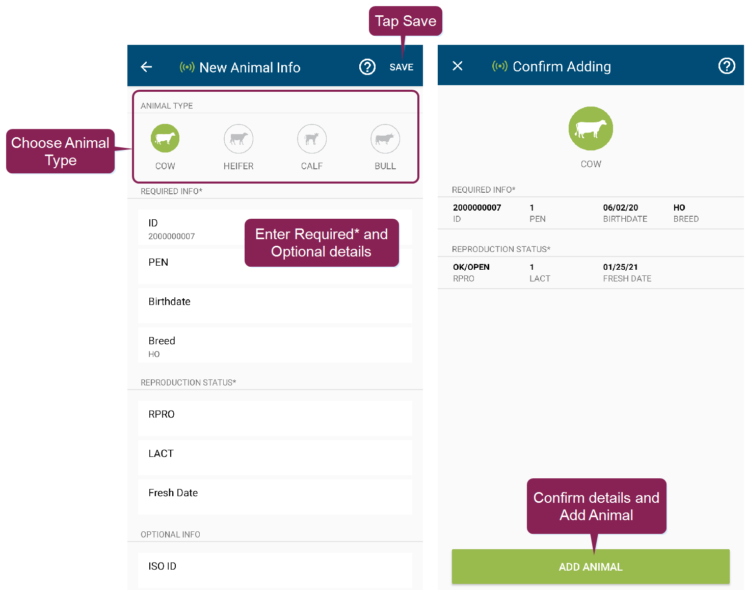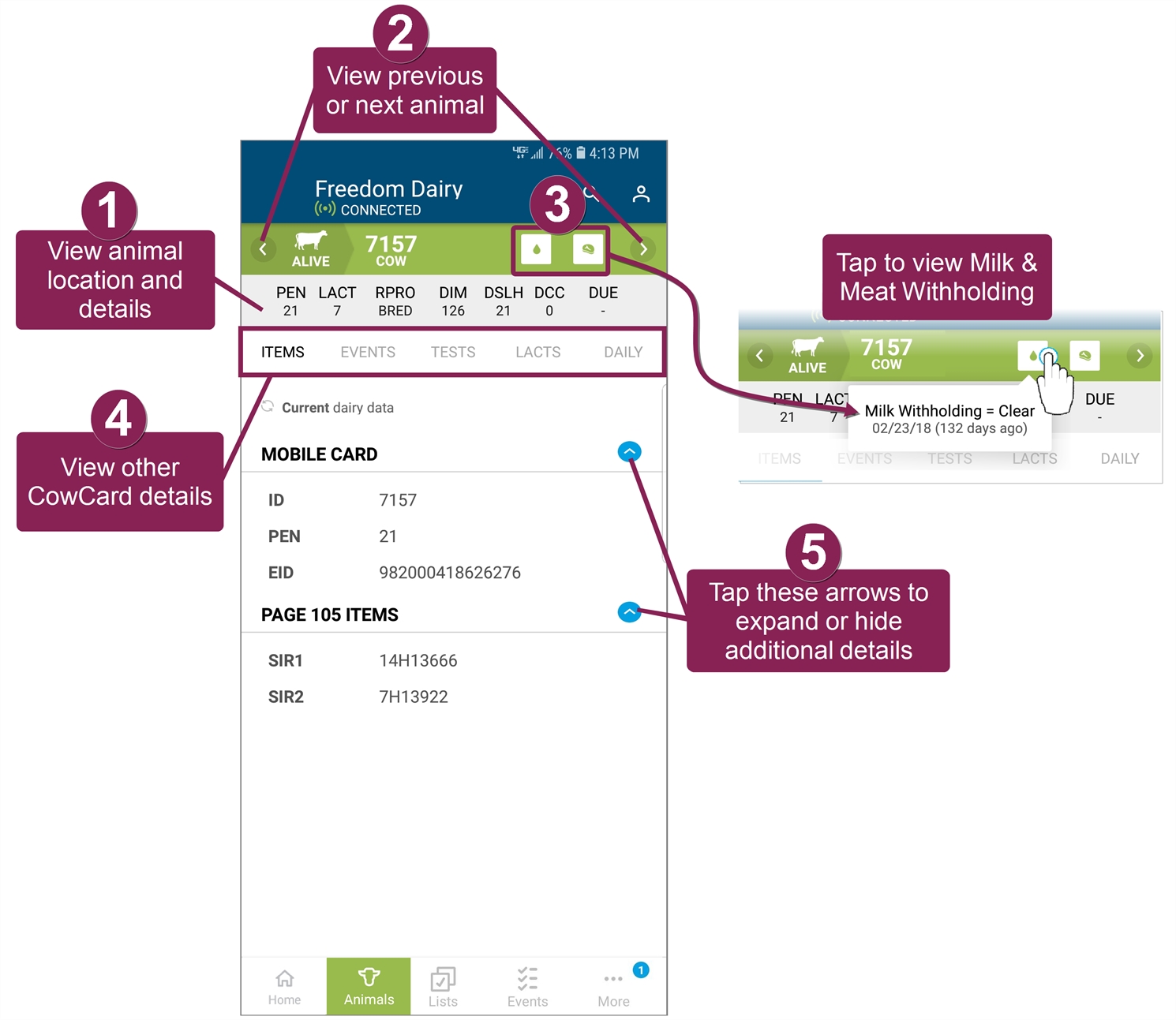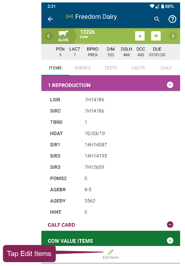The Animals page in the mobile app allows you to view animals in your herd. When you tap the Animals button at the bottom of the mobile app, it opens to a list of all animals in your herd. From there, use the search field at the top to find a specific animal, or use the Filters option to narrow the list by RPROClosed Reproductive code code. Tap on any animal in the list to view its CowCard.