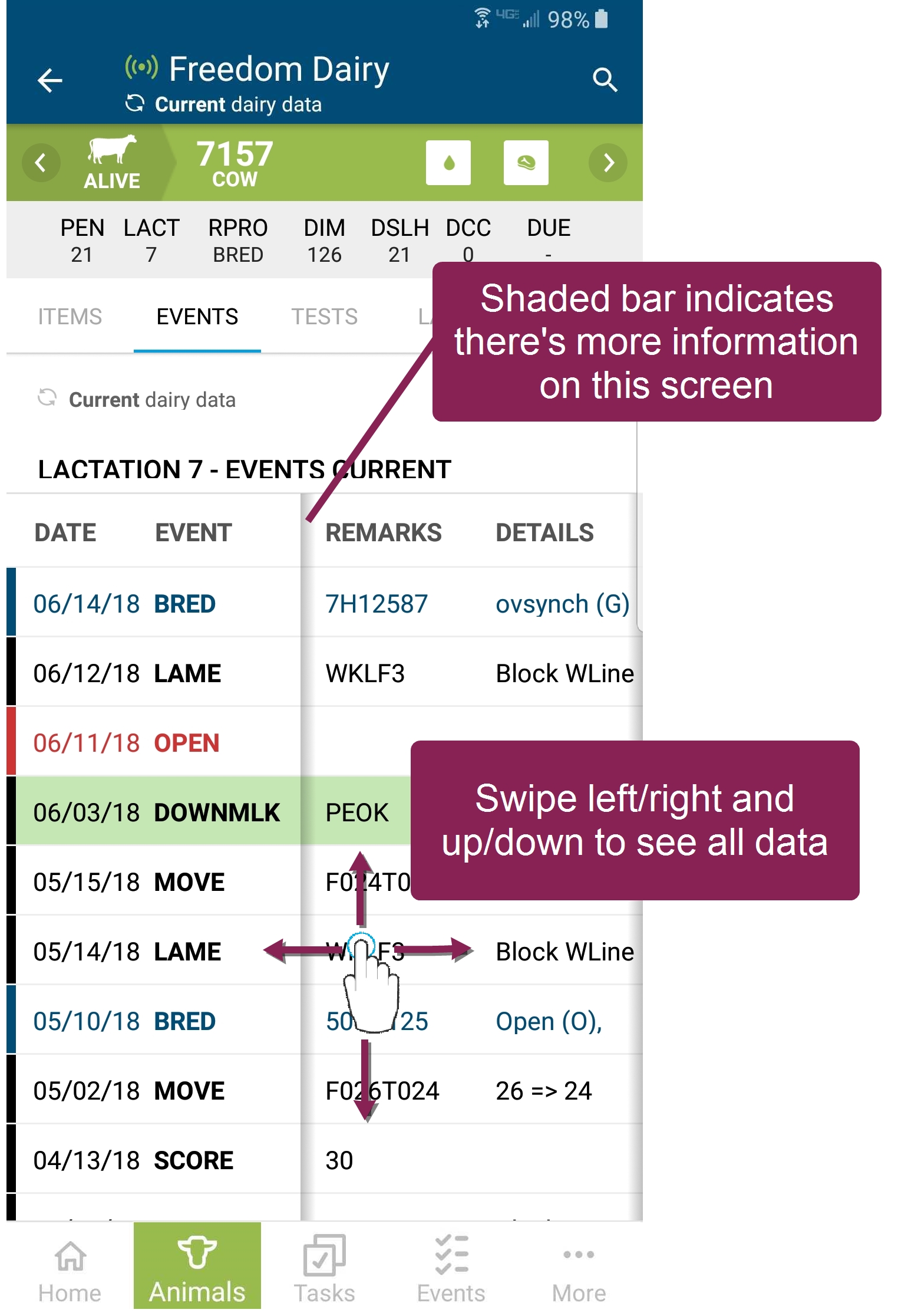 Please be aware that the mobile app displays only the most recent events, tests, and lactations, and only for animals that are alive and on the dairy. For full access to historical animal activity, tests, etc., use the web version of PULSE.