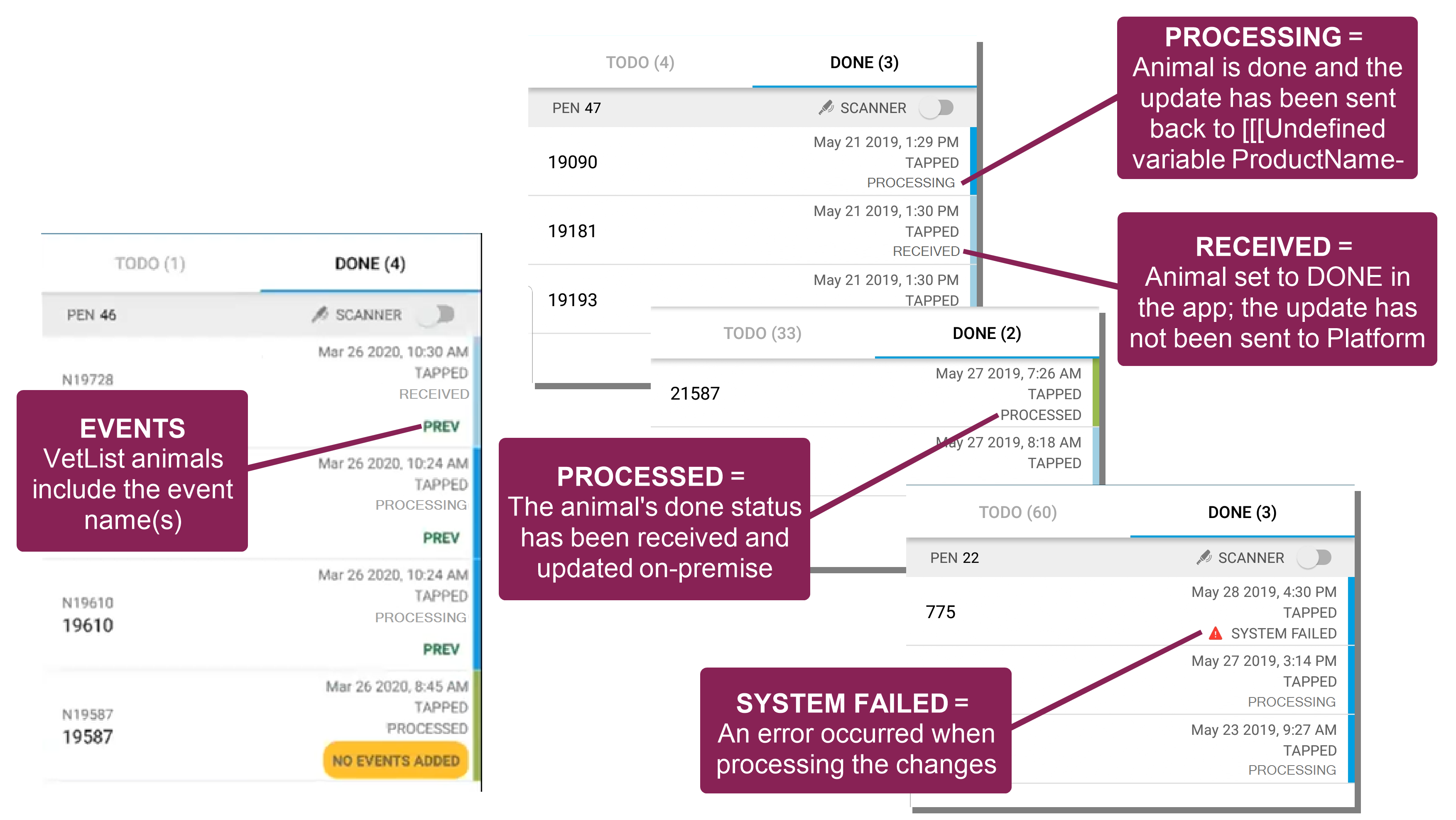 - Scan animals to see if they are on a worklist. For to-do lists, animals automatically move to DONE tab if they are scanned and on the list. Vet lists and hospital lists require you to mark animals as done after you finish processing them.