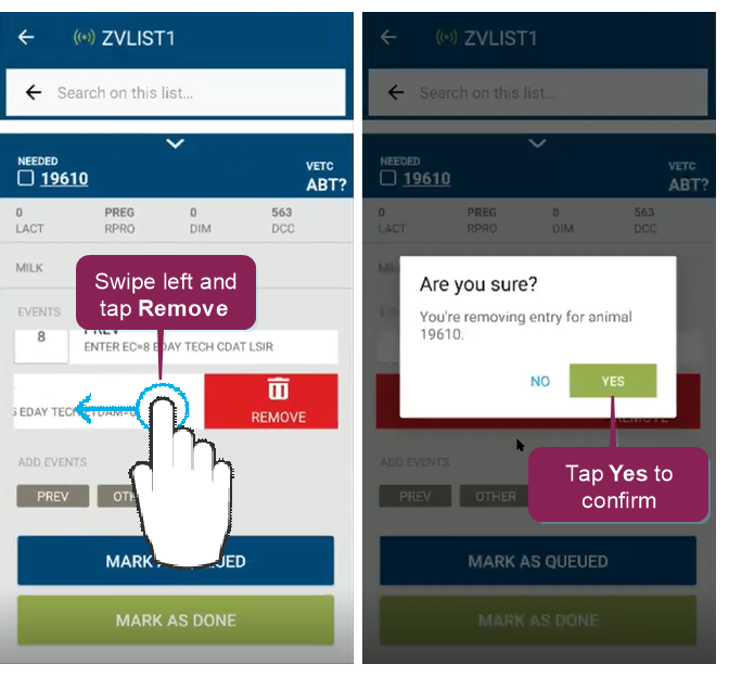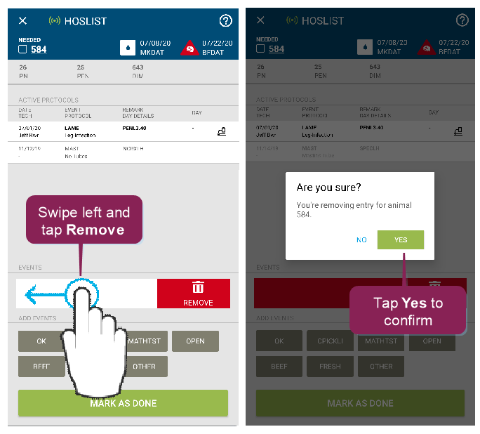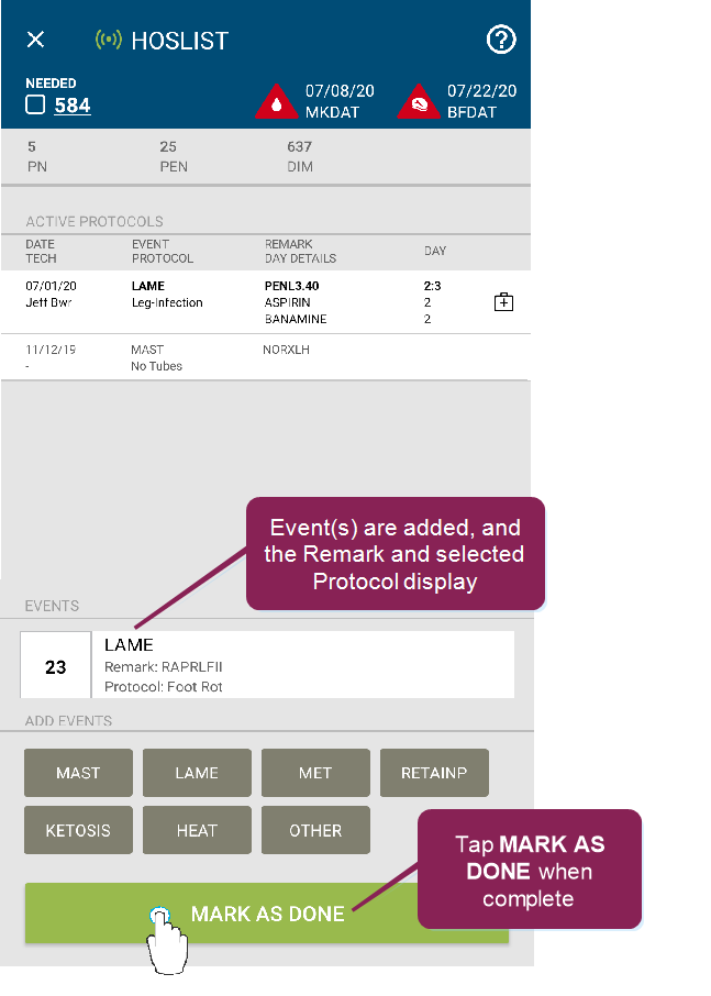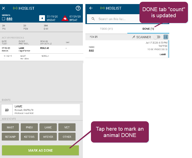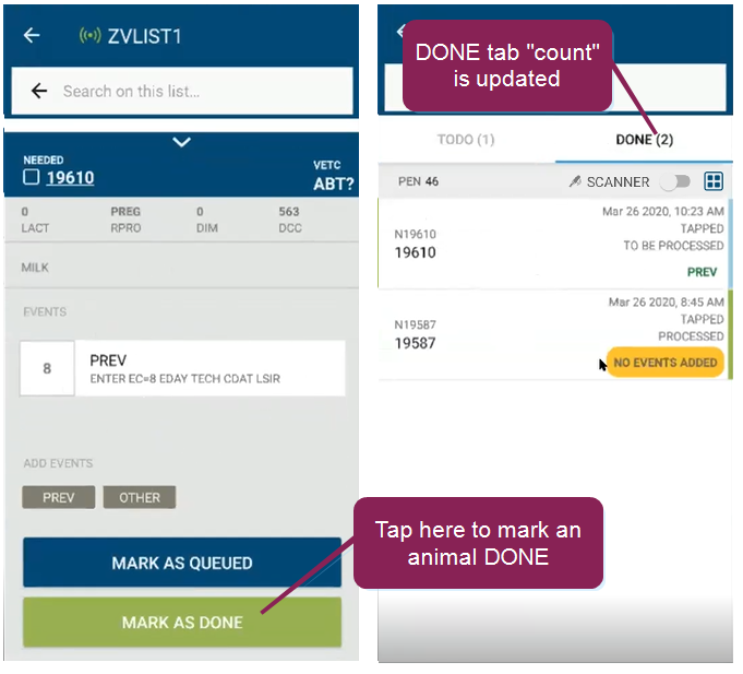 - After the treatment or check is complete and any new events are added, tap the Mark as Done box, which moves it to the DONE tab and plays the audible cue Done. You can also mark the animal as DONE directly from the event entry screen by selecting Save and Mark as Done.