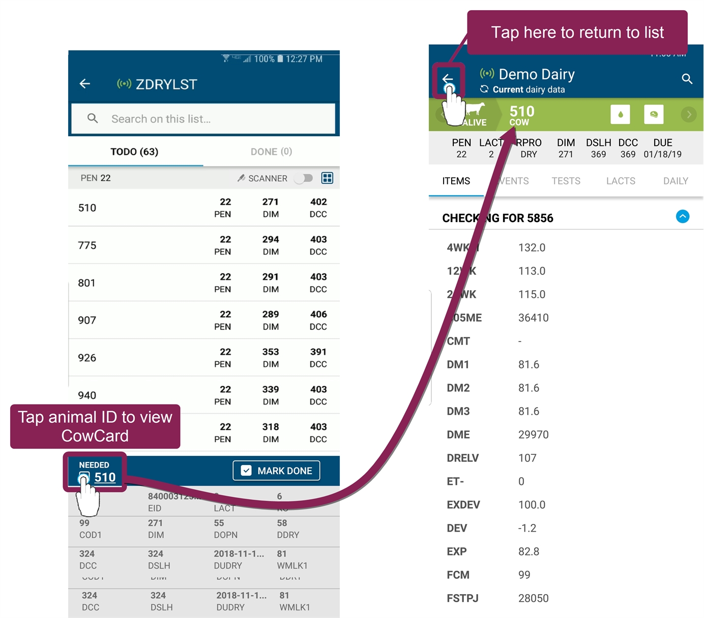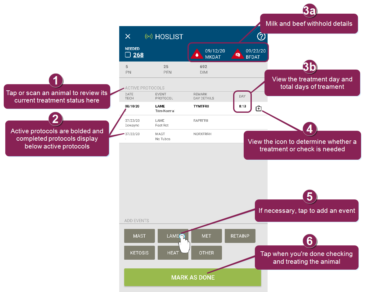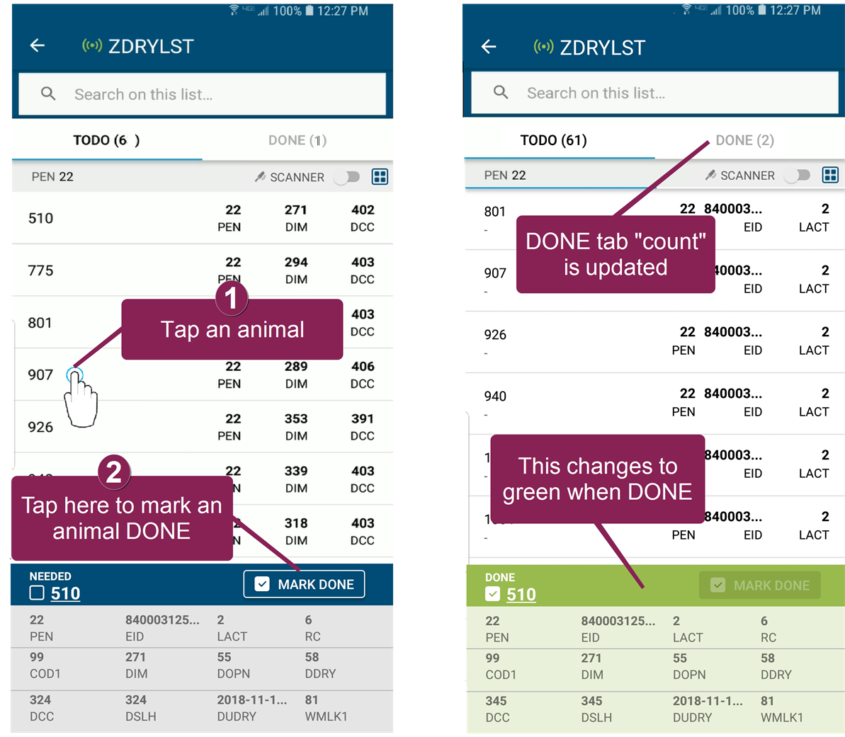 - If the animal is needed, tap the Mark Done box, which moves it to the DONE tab and plays the audible cue Done.