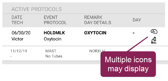 A dairy protocols include a series of treatments or tasks that follow a prescribed order and schedule. Protocols may be defined for reproduction purposes, to treat an illness, or for routine vaccinations. and total number of days in the protocol are displayed in the DAY field. Day 2:3 indicates the animal is on day 2 of a 3-day protocol.