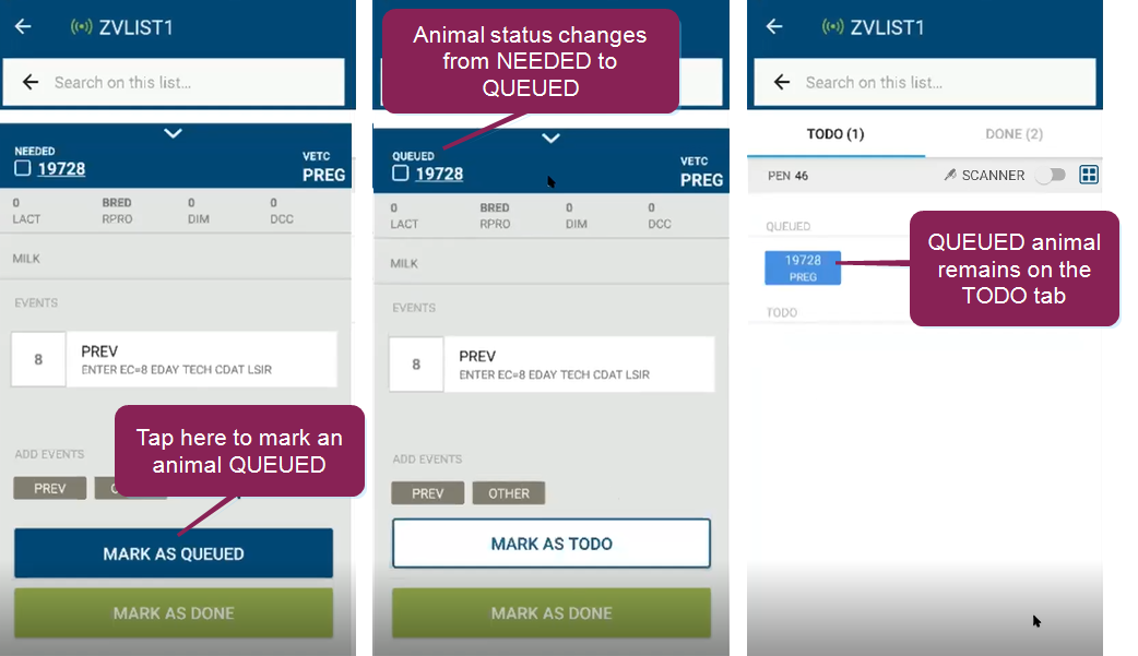 This changes the animal status to queued, and it remains in the QUEUED section of the TODO tab.
