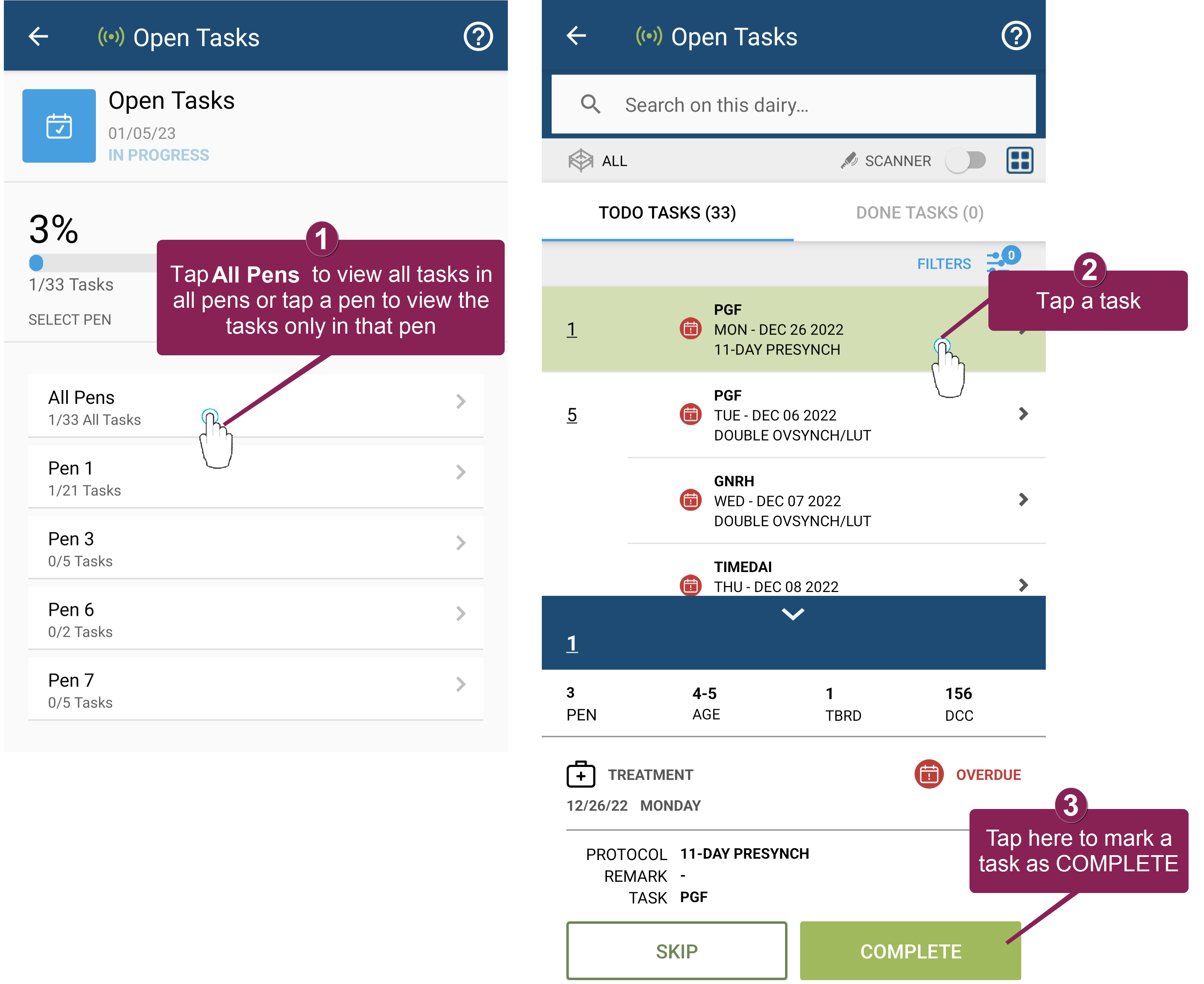 - From the Open Tasks list, tap All Pens to view all tasks in all pens or tap on a pen to view tasks only in that pen.