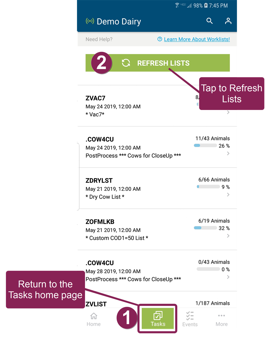 Worklists include animals that need to be seen by your dairy workers or animal health experts for a variety of reasons, such as performing pregnancy checks or treating animals in a hospital pen