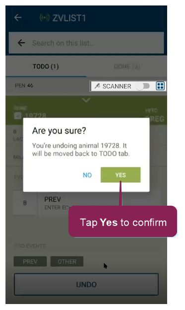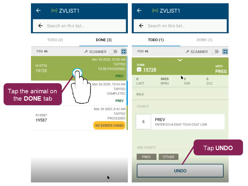 If you mistakenly mark an animal as DONE and have not processed the update yet, follow these steps to undo it: