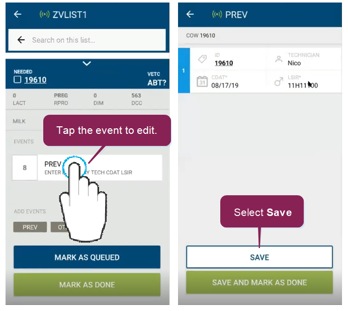 - Tap Save if you have additional events to add or Save and Mark as Done if this is the only event needed and your check is complete for this animal.
