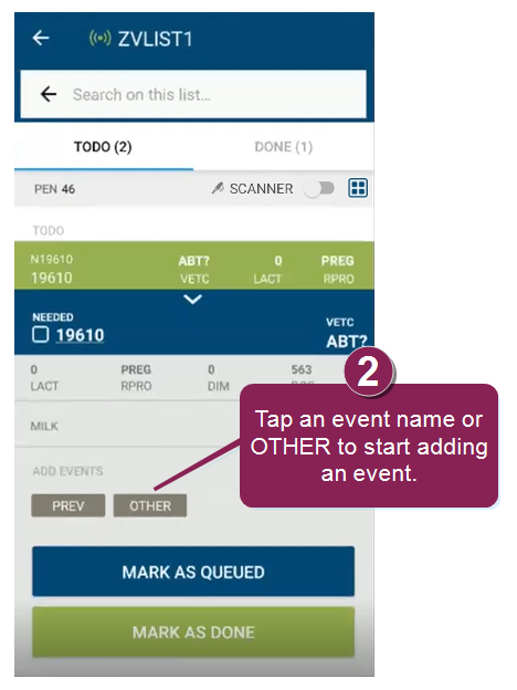 After events are added for the animal, tap the Mark as Done box, which moves it to the DONE tab and plays the audible cue Done. You can also mark the animal as DONE directly from the event entry screen by selecting Save and Mark as Done.