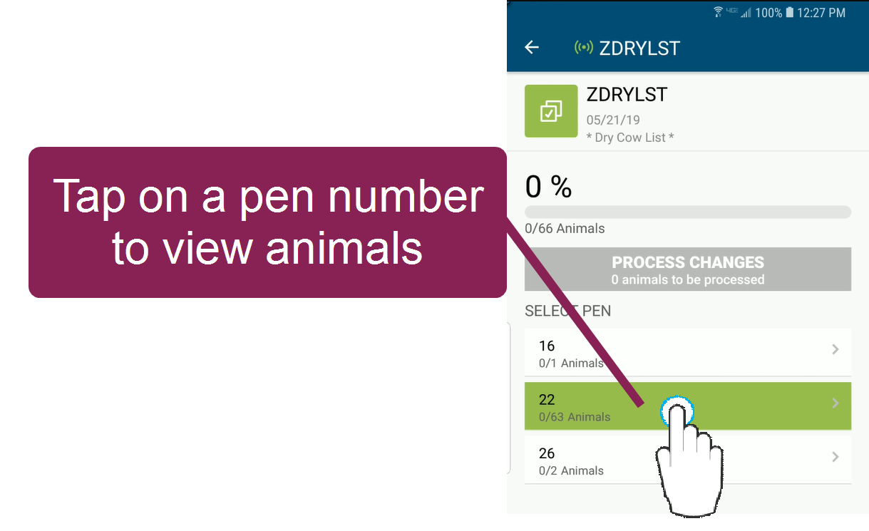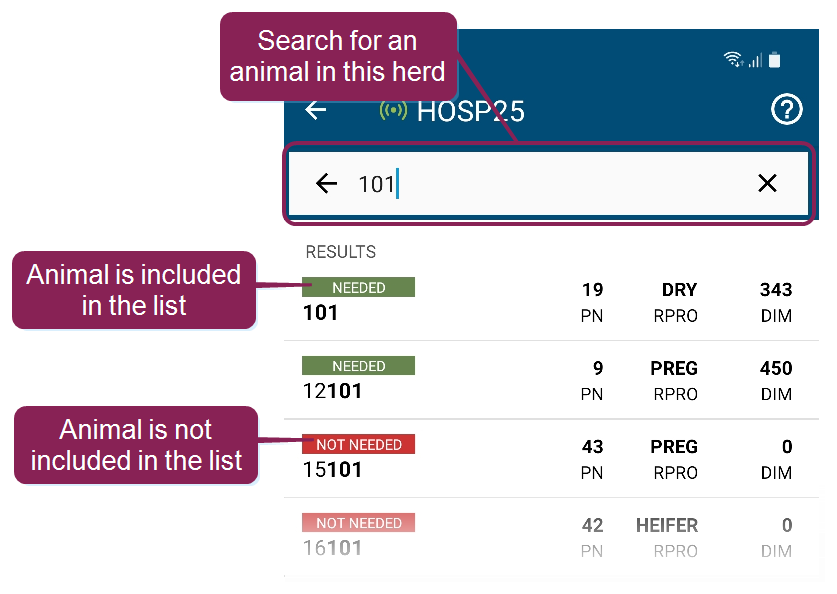 The list search feature is helpful if you have located a specific animal and need to see if it is in your list. You can enter the animal ID in the search bar at the top of the screen, regardless of which pen you are currently viewing.