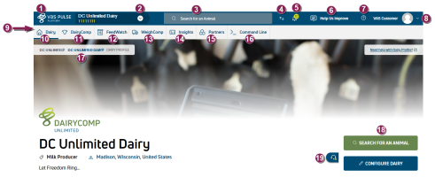 11. DairyComp/MyDC button: Click the DairyComp/MyDC button to view a menu of DairyComp/MyDC features in PULSE, including worklists, reports, and animals. Click here to find the full list of features under this menu option.