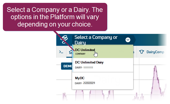 2. Current company or dairy: The company or dairy you are viewing is displayed in this field at the top left of the page. To view a different one, click the arrow and choose from the list of all your connected companies and dairies.