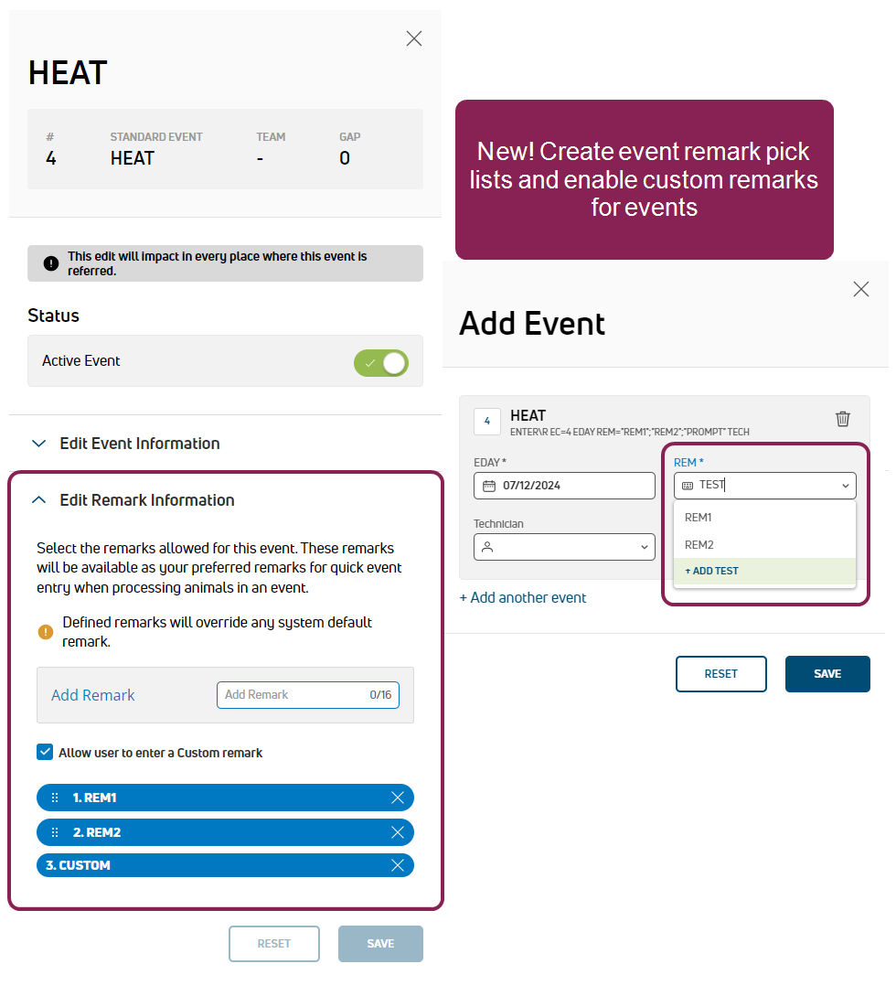 NEW FEATURE Create event remark pick lists and enable custom remarks for events! When editing Event Definitions in PULSE, you can now create event remark pick lists and enable custom remarks. This new functionality allows technicians to select a remark from your pre-defined list when adding an event, or they can enter a custom remark if you choose to allow it.