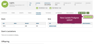 ENHANCEMENT Update sire details from the Pedigree tab on the CowCard! Use the new Update Pedigree button to update an animal's maternal grandsire and great grandsire from the CowCard Pedigree tab. This enhancement makes it easy to keep your herd's genetic data accurate! See Update Pedigree to learn more.