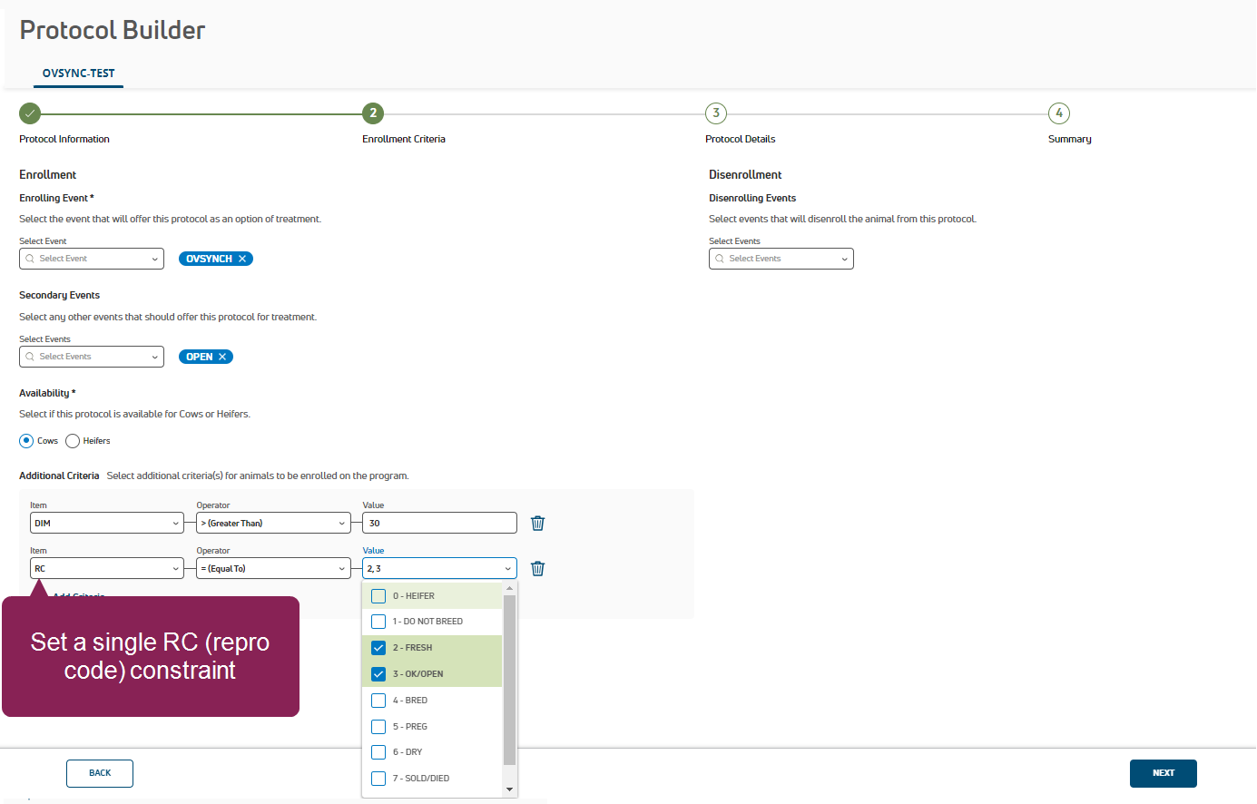 See Step 1: Define an OvSynch Protocol to learn more about setting protocol constraints.