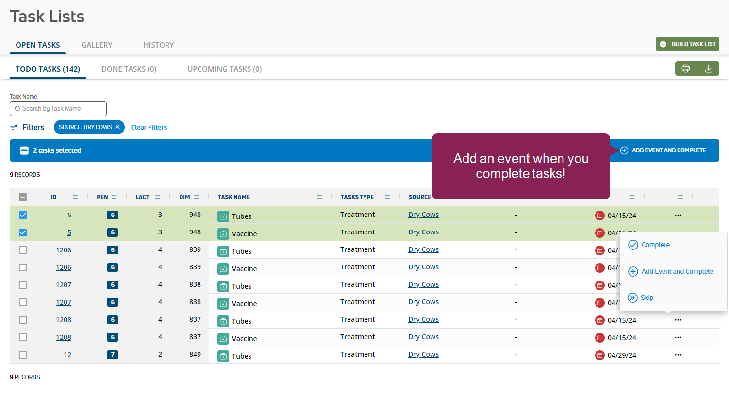 A dairy protocols include a series of treatments or tasks that follow a prescribed order and schedule. Protocols may be defined for reproduction purposes, to treat an illness, or for routine vaccinations.s, wellness checks, and any other scheduled tasks. Use Task Builder to generate a custom task list, or choose one of your saved lists from the Task Lists Gallery.