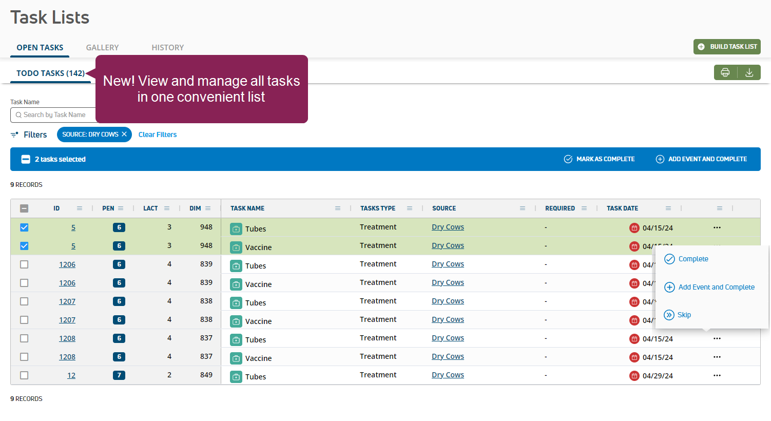 NEW FEATURE MyDC ONLY Task Lists are now available! MyDC dairies can now see and manage all daily animal activities on one convenient list! Use Task Lists to consolidate all required animal activities for the current day, including all OvSynch protocol