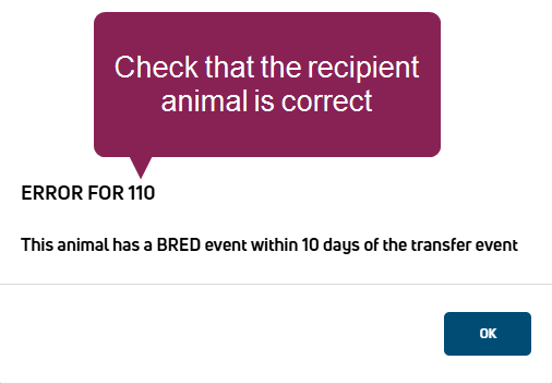 Be sure to check that the recipient animal is correct when you see the BRED error message. This and other built-in sanity checks protect your valuable investment and avoid wasting viable embryos. See TRANSFER Event Sanity Checks for additional PULSE checks and other event details.