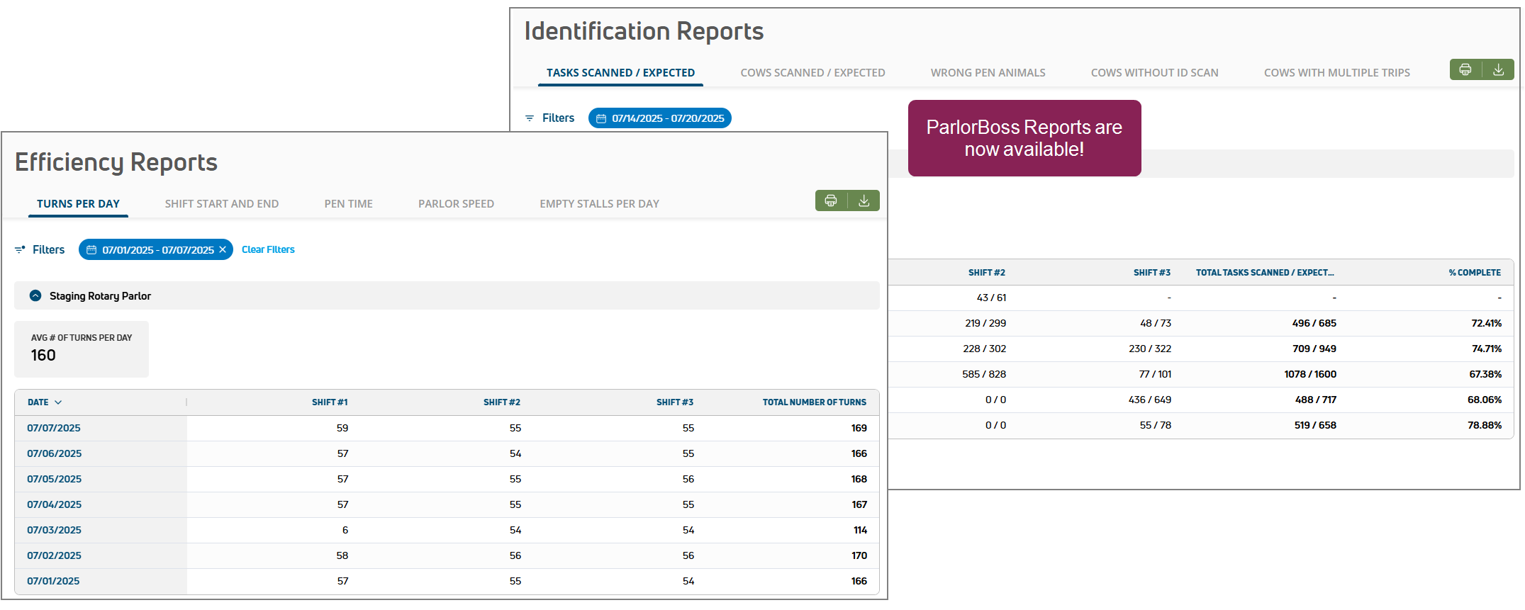 NEW FEATURE ParlorBoss Reports are now available in PULSE! Dairies with a ParlorBoss DairyComp integration can now view reports on their parlor's efficiency and animal identification accuracy. Use the reports to track and analyze specific parlor performance details and help your team evaluate animal prep routines, milking equipment attachment methods, and other parlor activities for potential improvement opportunities.