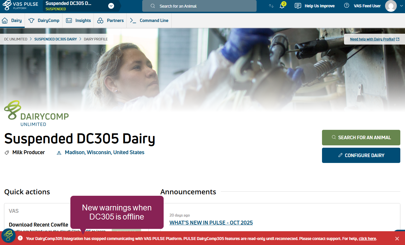 ENHANCEMENT DC Unlimited ONLY Protect your herd data with PULSE offline modeClosed The value that appears most often in a set of data. alerts! If your DC305Closed DairyComp 305 - VAS Dairy Management Software connection goes down, PULSE now warns you and specifies the actions you need to take. This ensures you don't inadvertently edit outdated animal records and keeps your PULSE data current. PULSE detects three different offline modes to safeguard your herd data. See Offline DC305 Integration to learn how to address warnings and make sure your latest animal records are live in PULSE and the mobile app.