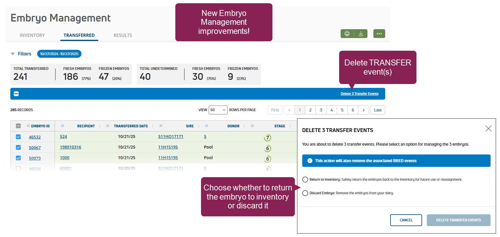 • You can now delete transferred embryos and choose to either return them to inventory or discard them. This helps to correct mistakes if the wrong embryo was selected during a TRANSFER event. See Delete Transferred Embryos to learn more.