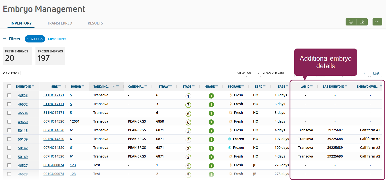 You can also filter your Embryo Inventory, Transferred Embryos, and Embryo Results pages using the new fields. See Embryo Management to learn more about managing your embryos in PULSE.
