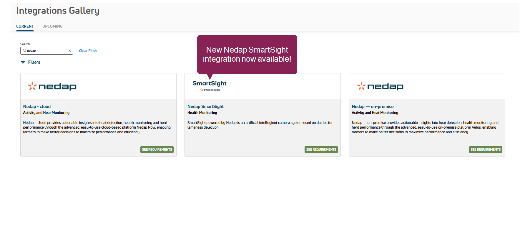 ENHANCEMENT Nedap SmartSight integration now available! VAS is committed to partnering with other technology leaders in the dairy industry, and we are excited to announce the general availability of Nedap SmartSight integration.  SmartSight powered by Nedap is an AI-powered camera system that helps detect lameness in cows during milking. A consistent, objective, and automatic tool for creating a lame score on a cow at every milking. These scores help generate actionable insights, including prioritized trim lists and monitoring recovery after trimming. See Nedap SmartSight Overview to learn more.
