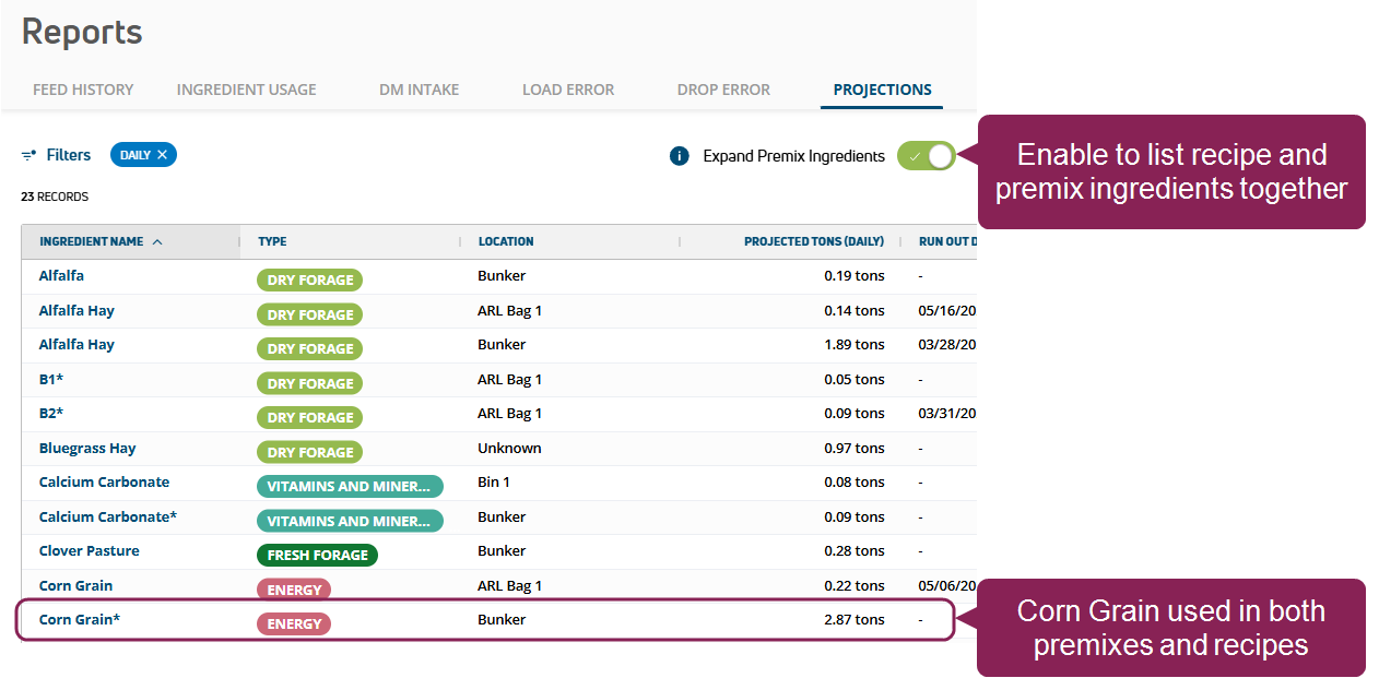 • The Ingredient Usage Report now lists whether ingredients are used in premixes or in regular feedings, so you can fully understand your actual ingredient costs and better forecast your herd's feeding needs.
